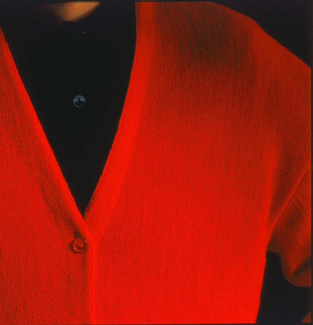 Detail of a red garter-stitch sweater