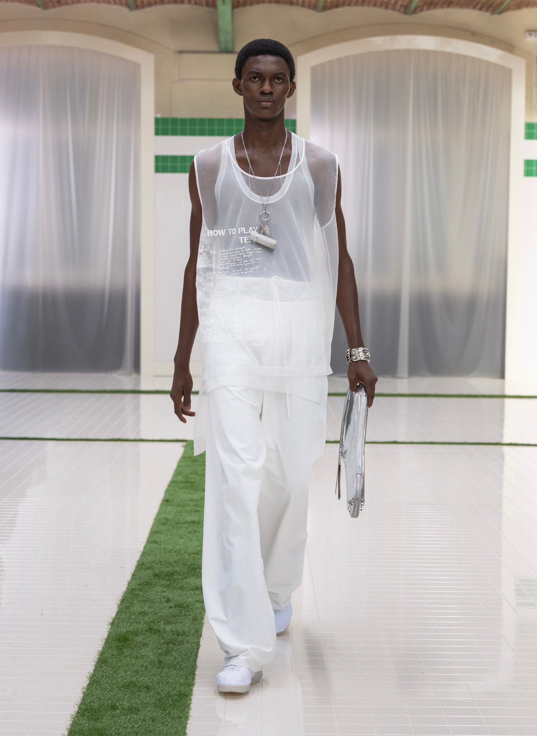 Sensuality, unfinished proportions, and athletic heritage remixed with vintage sportswear vibes are the baseline for an elegant yet dynamic wardrobe of sheer polos, statements in mirror leather, robe-like trench coats emblazoned “Tennis for Everyone,” and tech-silk flyaway nylon pieces that create tension with utilitarian rubberized cottons and wet-look nylon.