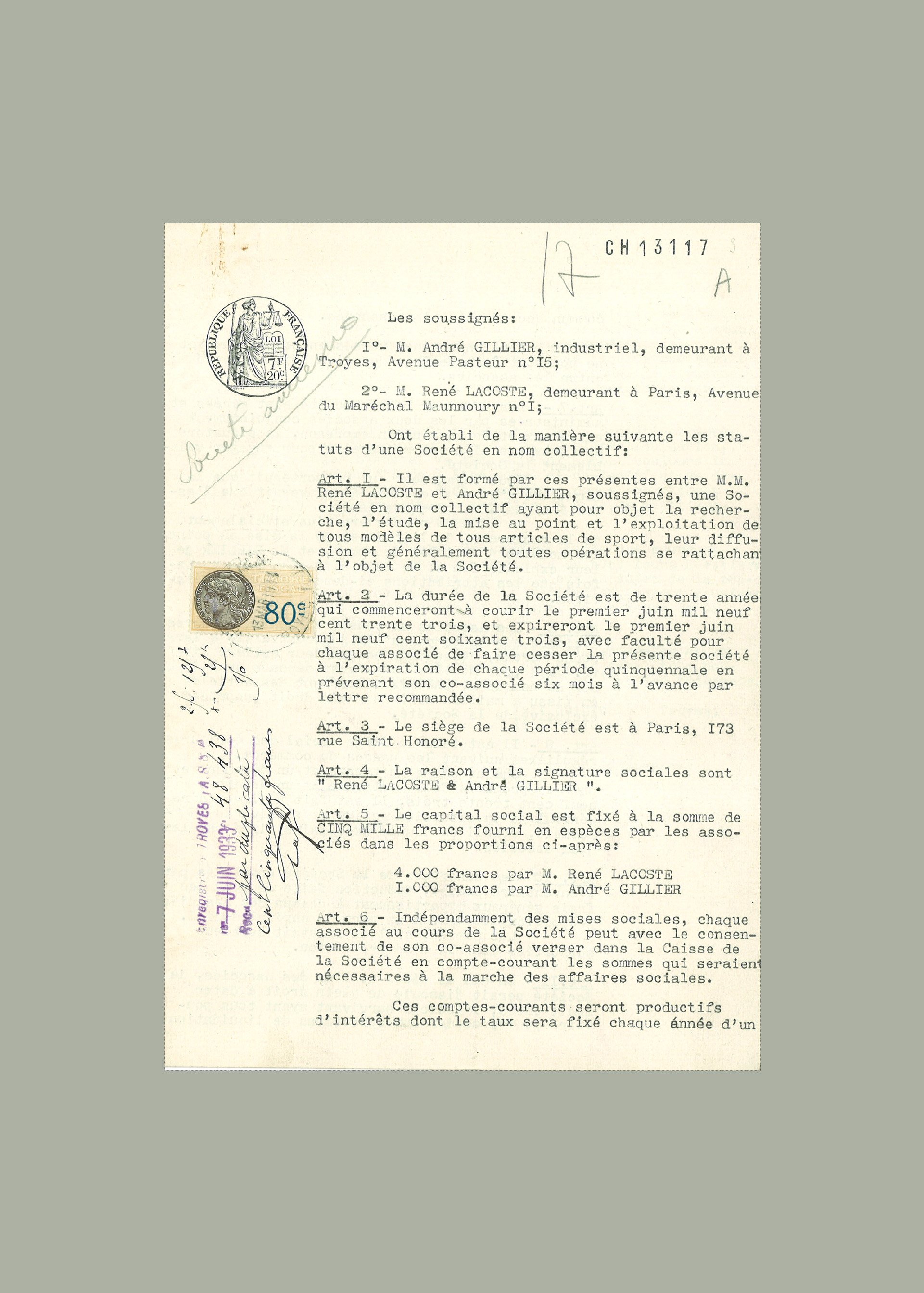 Company by-laws René Lacoste & André Gillier, 1933 © Archives Lacoste